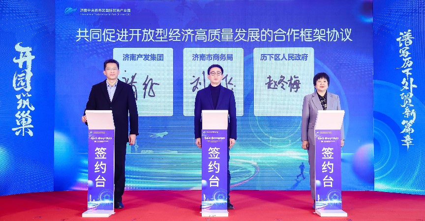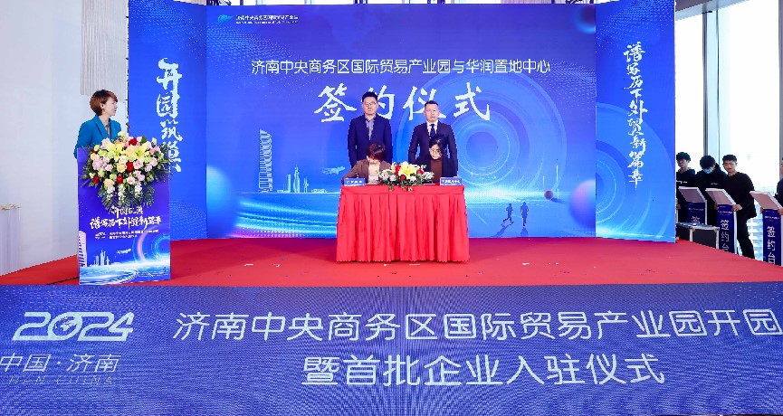 在入駐簽約環(huán)節(jié),濟南國商園區(qū)運營管理有限公司總經(jīng)理陳蕾與華潤置地中心項目負責人李靜宜簽訂了委托運營協(xié)議;劉燕飛、趙冬梅、褚征分別代表濟南市商務局、濟南市歷下區(qū)人民政府、濟南產(chǎn)發(fā)集團共同簽署《共同促進開放型經(jīng)濟高質(zhì)量發(fā)展合作框架協(xié)議書》;王紅、楊傳軍、趙治文、楊福濤、王海清、黃蓓、邵丹丹共同按下啟動開園按鈕,宣告濟南中央商務區(qū)國際貿(mào)易產(chǎn)業(yè)園正式開園。